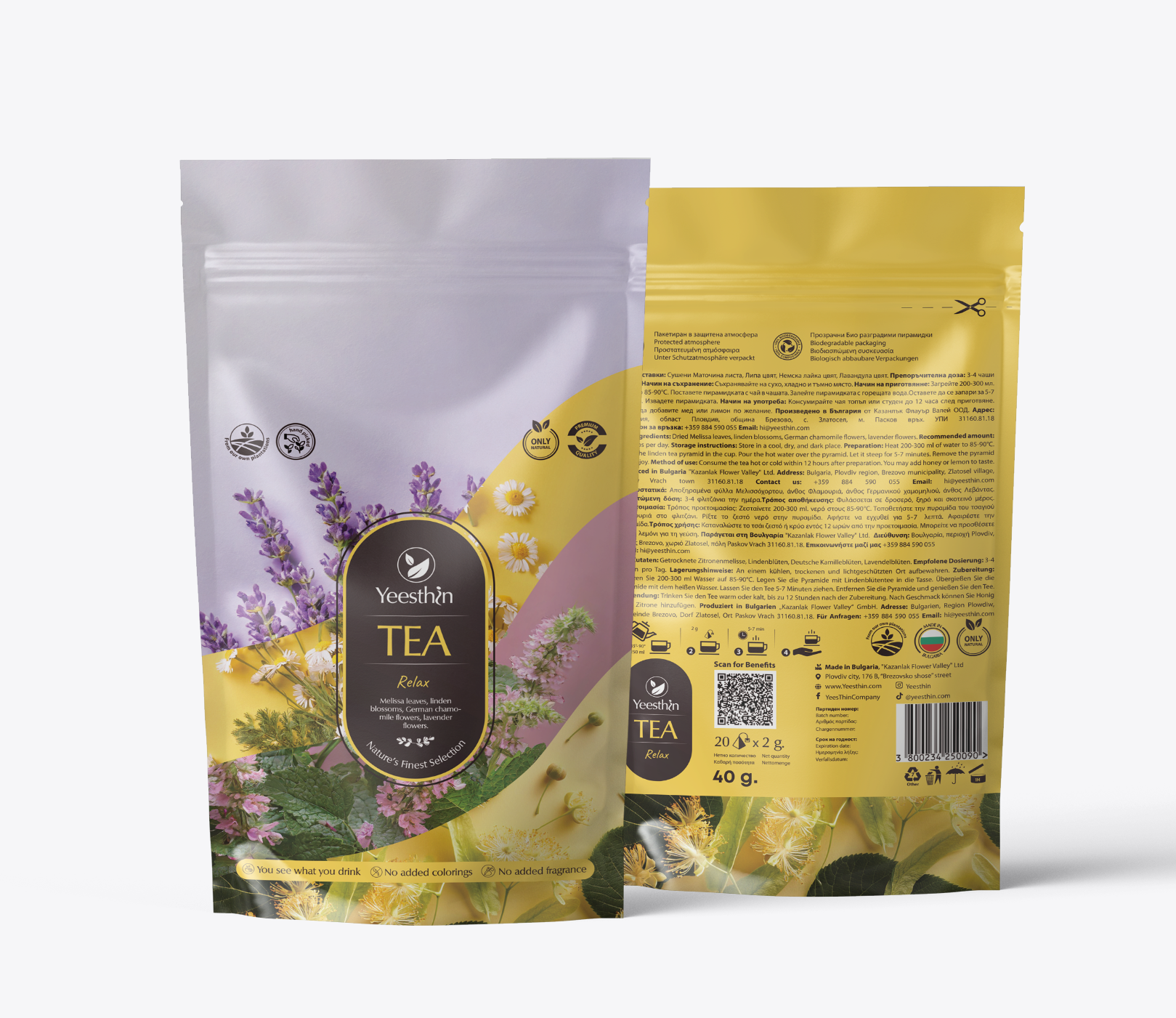Relax Tea is a premium blend of carefully selected herbs grown in ecologically clean areas of Bulgaria. The ingredients are dried at low temperatures to preserve their beneficial properties and aromas. The tea is packaged in biodegradable and transparent pyramids, allowing you to see the real contents inside. This ensures maximum convenience and freshness with every cup.